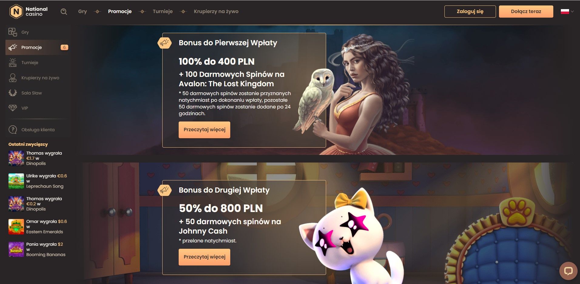 W National Casino sloty to naprawdę świetna rozrywka. Kasyno współpracuje z najlepszymi producentami i dba o aktualizowanie swojej oferty. Na pewno spotkacie się z tytułami, które nie występują u innych kasyn właśnie ze względu na bieżące aktualizacje w National Casino. Warto również zwrócić uwagę na to, że gracze z Polski nie mają żadnych problemów z przejściem procedury rejestracji, co bywa problemem w niektórych kasynach online. Strona kasyna jest dostępna w języku polskim i National Casino jest otwarte na doładowania salda z wykorzystaniem naszej rodzimej waluty.