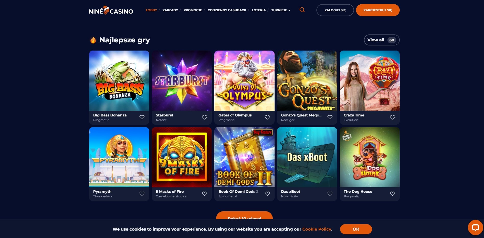 Za kasynem Ninecasino stoi doświadczona grupa osób, która doskonale zdaje sobie sprawę z aktualnych potrzeb graczy. Jedną z nich jest chęć gry na najlepszych automatach i grach hazardowych. Te gwarantują wyłącznie najwięksi i najpopularniejsi dostawcy. Stąd kasyno zdecydowało się podpisać z nimi stosowne umowy. W lobby znajdziesz gry od wielu cenionych dostawców, a wśród nich takie studia, jak chociażby Play’n GO, Pragmatic Play, Evolution Gaming, Microgaming oraz NetEnt.