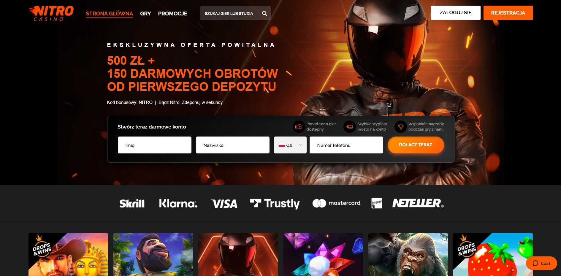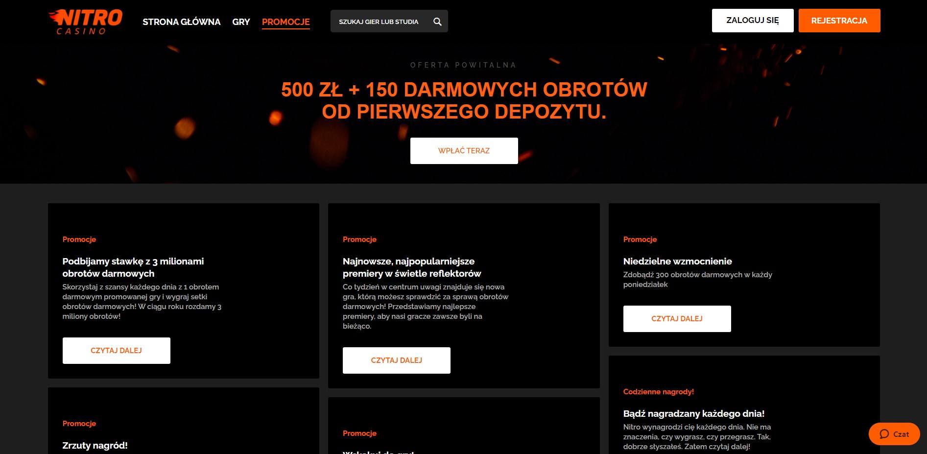 Nitro to solidny, rzetelnie zrealizowany z dopracowaniem najmniejszych szczegółów serwis hazardowy. Zapewnia swoim użytkownikom liczne oferty promocyjne związane z wpłatami, bez depozytu, a także turnieje i loterie. Ogromna biblioteka gier sprawia, że przed użytkownikiem otwiera się wspaniały świat gier losowych o praktycznie nieskończonym potencjale. Całość została przedstawiona za pomocą przyjemnej czarno-pomarańczowej strony internetowej, która nastraja do dalszej zabawy. Nitro na telefon pozwala na wygodną grę z dowolnego miejsca z dostępem do Internetu. Wystarczy mieć ze sobą urządzenie przenośne i to tak jakby nosić przy sobie 2 000 gier.